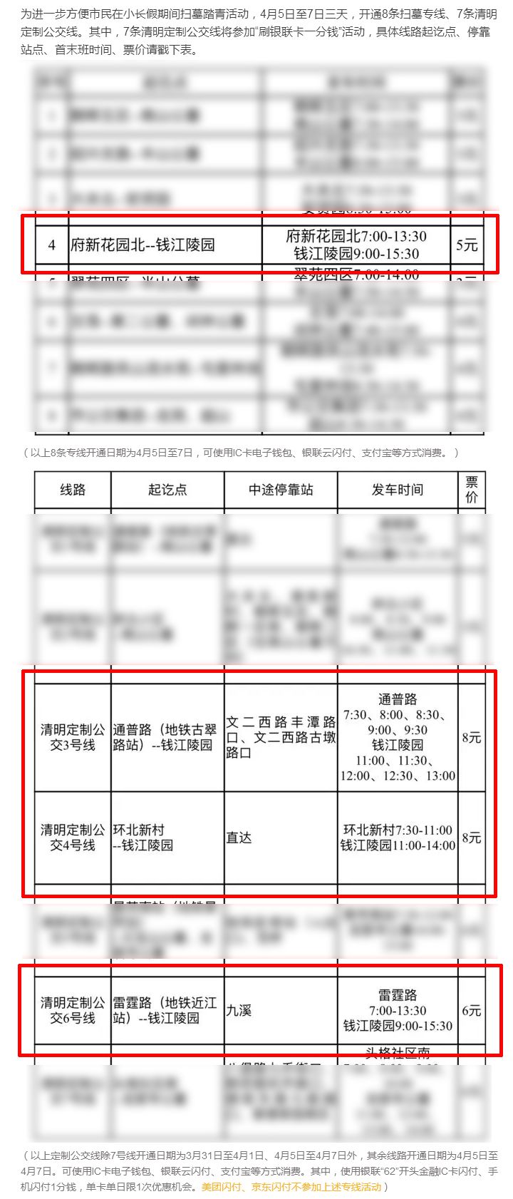 清明扫墓定制公交线路 根据公交集团去年开通的线路方案,今年延续去年的方式,开通定制公交路线,具体的线路安排,点击下方阅读原文查看公交集团发布的公告。 开通时间:2018年4月5日—7日 三天 开通路线:1、近江地铁站-钱江陵园(清明定制公交6号线) 上车点:婺江路上城区公安消防大队对面(近江地铁站C出口旁) 此趟扫墓专线在近江地铁站始发,并有之江路南复路口和九溪两个沿途停靠点。 近江地铁站:可乘坐地铁1号线、地铁4号线及9、29、32、71、119、216、334、1001路等车次到达 之江路南复路口:公交87路、190路之江路南复路口停靠点 九溪:公交4、39、103、189、190、202、280、308、314、318、324、334、354、439、514、1400路九溪站停靠点 开通路线:2、古翠路地铁站—钱江陵园(清明定制公交3号线) 上车点:通普路文二西路口(古翠路地铁站B出口旁) 此趟扫墓专线在古翠路地铁站始发,并有文二西路丰潭路口和文二西路古墩路口两个沿途停靠点。 古翠路地铁站:可乘坐地铁2号线、63、74、77、86、130、199、286B、1218、1219、1300M路等车次到达 文二西路丰潭路口:公交63、74、77、86、130、199、1300M路文二西路丰潭路口停靠点 文二西路古墩路口:公交41、86、118、130、194、199、261路文二西路古墩路口停靠点 开通路线:3、环北新村—钱江陵园(清明定制公交4号线) 以上线路为定制线路,详情请致电公交集团服务热线85191122咨询